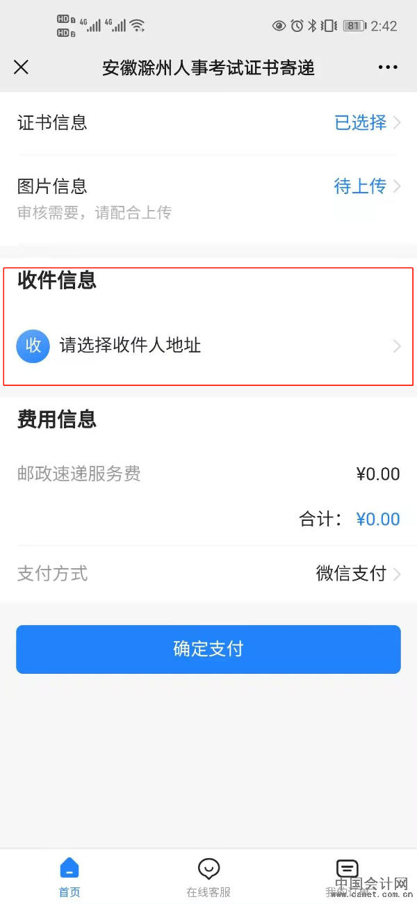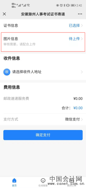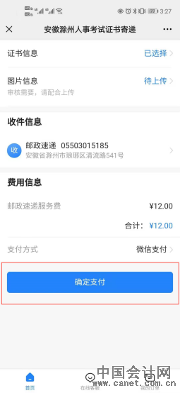 2、郵寄服務(wù)辦理流程:掃描中國郵政郵寄業(yè)務(wù)二維碼—填寫考生信息—核對考生證書信息—上傳考生本人手持身份證照片—填寫收件地址—系統(tǒng)自動計費—線上支付—郵寄送達(dá)。