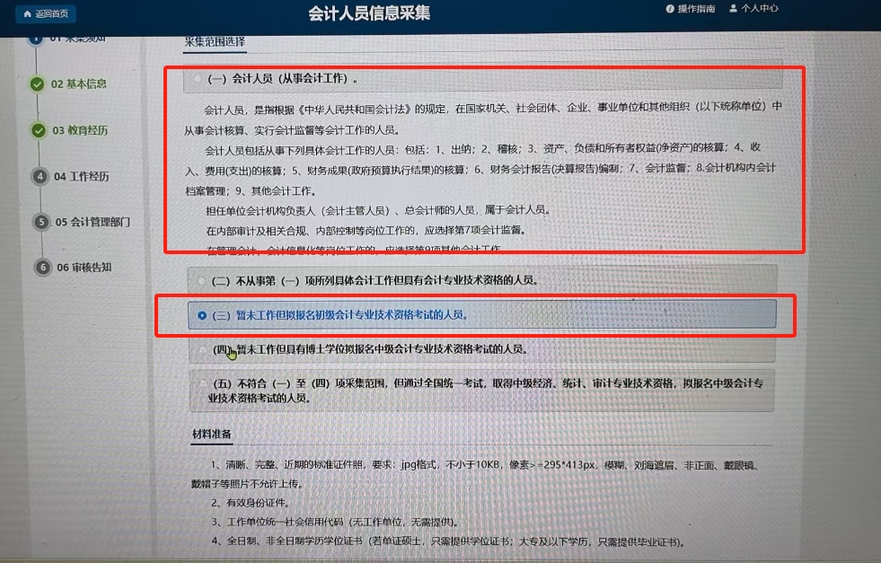 登錄后點(diǎn)擊首頁“會(huì)計(jì)人員信息采集 ”進(jìn)入信息采集頁面。請仔細(xì)閱讀“采集須知 ——采集范圍選擇 ”,并結(jié)合個(gè)人實(shí)際情況選擇。凡從事過會(huì)計(jì)工作(無論現(xiàn)在是否在職在崗)均可選擇(一)會(huì)計(jì)人員;從未有過會(huì)計(jì)工作經(jīng)歷的請選擇(三)暫未工作但擬報(bào)名初級(jí)會(huì)計(jì)專業(yè)技術(shù)資格考試的人員。完成采集范圍選擇后點(diǎn)擊“保存并下一步 ”進(jìn)入到基本信息頁。