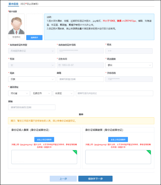 在基本信息頁中需上傳標(biāo)準(zhǔn)證件照片(照片要求:jpg 格式,不小于 10KB,像素>=295*413px,模糊、劉海遮眉、非正面、戴眼鏡、戴帽子等照片不允許上傳)。其中,基本信息中有效身份證件類型、有效身份證件號(hào)碼、姓名、性別、出生年月以及手機(jī)號(hào)碼將自動(dòng)讀取注冊時(shí)所填的信息。附件上傳請根據(jù)所填寫的證件類型上傳身份證明人像面、身份證明國徽面 (附件要求:上傳 jpg、、png 圖片文件,大于 20KB 且不超過 500KB)。完成基本信息填寫后點(diǎn)擊“保存并下一步 ”進(jìn)入到教育經(jīng)歷頁面。提示:非本地戶籍暫未工作且不屬于在校學(xué)生的人員,上傳本地居住證。居住證和身份證合并到一張圖片。