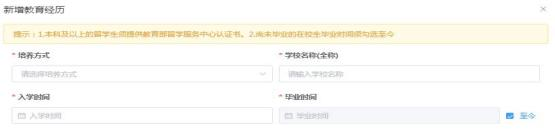 在教育經(jīng)歷頁中,點(diǎn)擊新增進(jìn)行教育經(jīng)歷的信息采集。新增教育經(jīng)歷 彈窗包括培養(yǎng)方式、學(xué)校名稱、學(xué)歷、學(xué)位(填寫已取得證書的學(xué)歷、學(xué)位)、所學(xué)專業(yè)、入學(xué)時(shí)間、畢業(yè)時(shí)間、學(xué)歷證書編號(hào)、學(xué)位證書編號(hào)。