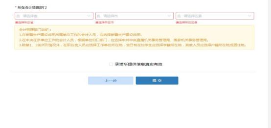 選擇會(huì)計(jì)管理部門后,勾選“承諾所提供信息真實(shí)有效 ”后提交審核。