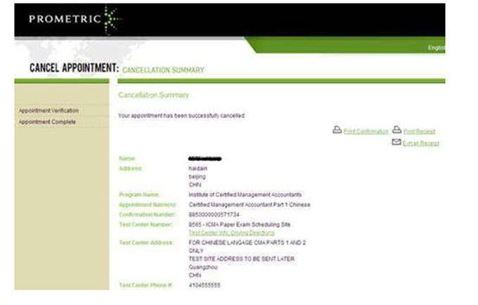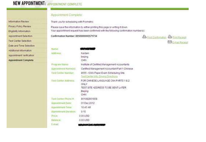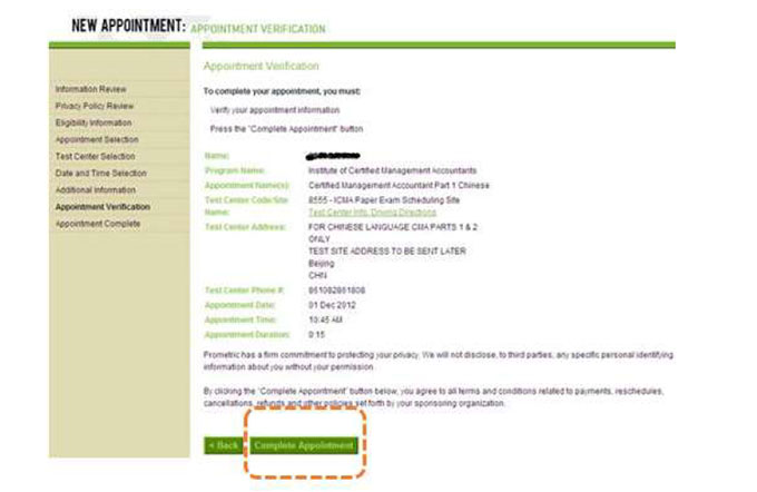 第五步、重新選擇考場和考試日期(參考《如何預(yù)約CMA考試?》這篇文章,擊此鏈接,) ,完成注冊預(yù)約信息,點擊“Complete Appointment”確認(rèn)預(yù)約。如果想取消CMA考試預(yù)約,請直接看第七步操縱。