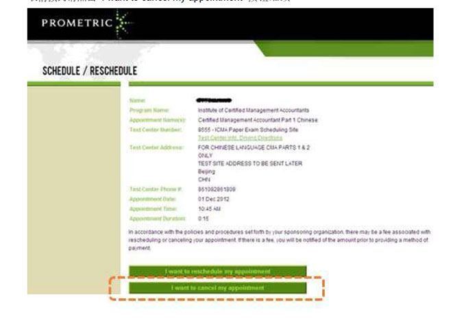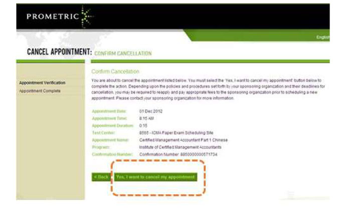 第八步、確認(rèn)取消考試,確認(rèn)前請聯(lián)系廠商確認(rèn)考試費的政策,然后點擊“Yes,I want to cancel my appointment”確認(rèn)取消。