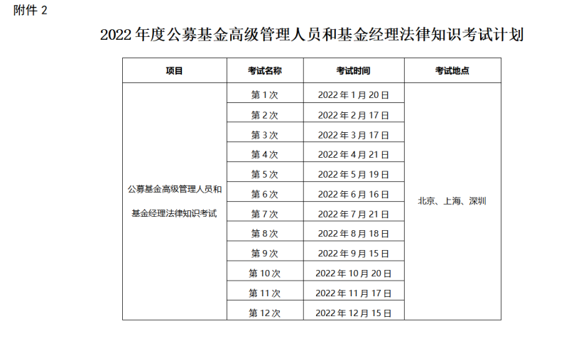 2、公募基金高級(jí)管理人員和基金經(jīng)理法律知識(shí)考試擬在北京、上海、深圳舉辦12次。