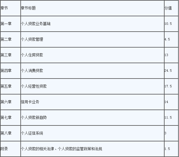 在對歷年銀行從業(yè)資格考試試題的匯總分析基礎(chǔ)上,將銀行從業(yè)資格考試科目《個人貸款》分值分布總結(jié)如下: